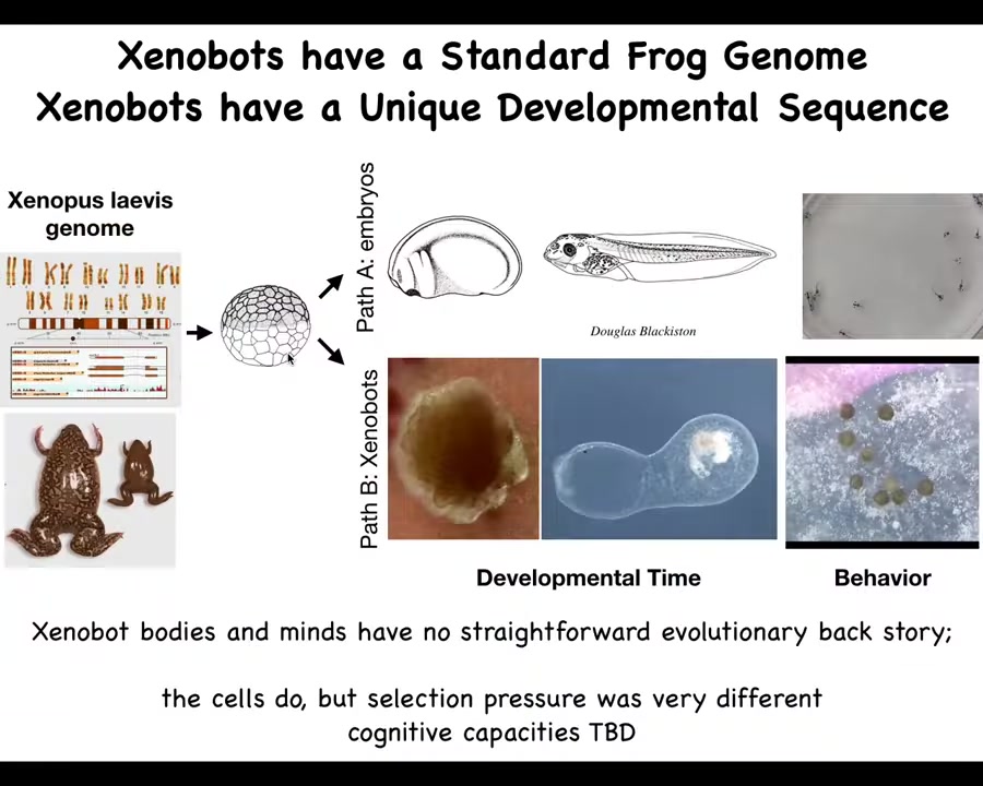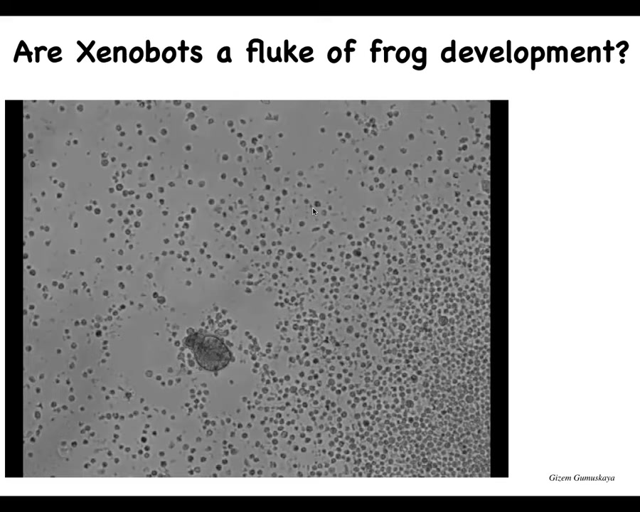 The amazing thing about this is that there haven't been any Zenobots before. There's never been any selection to be a good Zenobot. Where do their properties come from? What did the frog genome learn during its many years on Earth? It certainly learned to do this. It's hardware that can make this set of stages with behavior. I hear some tadpoles running around. Apparently, that's not the only thing it can do. It can do this. While this was under strong evolutionary selection for specific environments, these never directly existed until we made them. This is an 83-day-old Zenobot. What is it becoming? What shape is this? Where does the kinematic replication come from? It's a remarkable thing to be thinking about the goals and competencies of creatures that have never been here. You can't say that it's evolution that gave it to them. They have no straightforward evolutionary backstory like all the other animals that everybody studies. Soon, we will have some actual behavioral studies out, so stay tuned for that. We've been studying their ability to sense, to remember, to behave, and that's all coming.