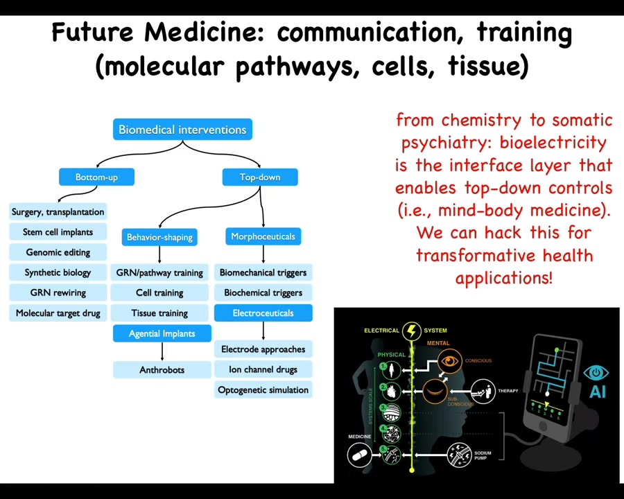We think that AI is going to be an important component of this to be able to crack the communication interfaces so that we know how to talk to all the different levels. The way we talk to each other at the highest cognitive level, we should be able to talk to all of the somatic intelligences within the body. I think that future medicine is going to look a lot more like somatic psychiatry than it's going to look like chemistry. It's going to be quite different.