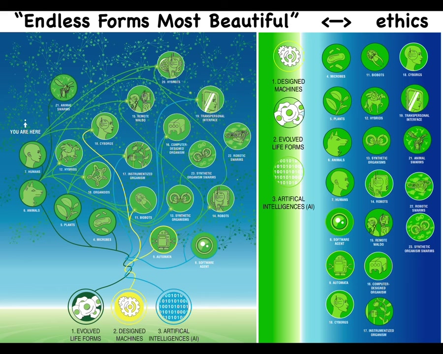 Everything that Darwin meant when he said "the natural world and its endless forms, most beautiful" is like a tiny little region in this whole space of bodies and minds. Because every combination of evolved material, engineered material, and software is some kind of possible embodied being: hybrids and cyborgs, augmented humans, and weird combinations of material extended both biologically and technologically. All of these things we are going to live with, and most of them are going to be nowhere on the tree of life with us. They're quite different. And this means that we're going to have to develop novel forms of ethics that go beyond what do you look like and how did you get here, meaning evolved or engineered, in terms of knowing how we deal with others that are not quite like us. So that achieving some sort of ethical synthbiosis with a very diverse range of beings goes way beyond the kind of control goals that we have in engineering and more like a bi-directional vulnerability and relationship.