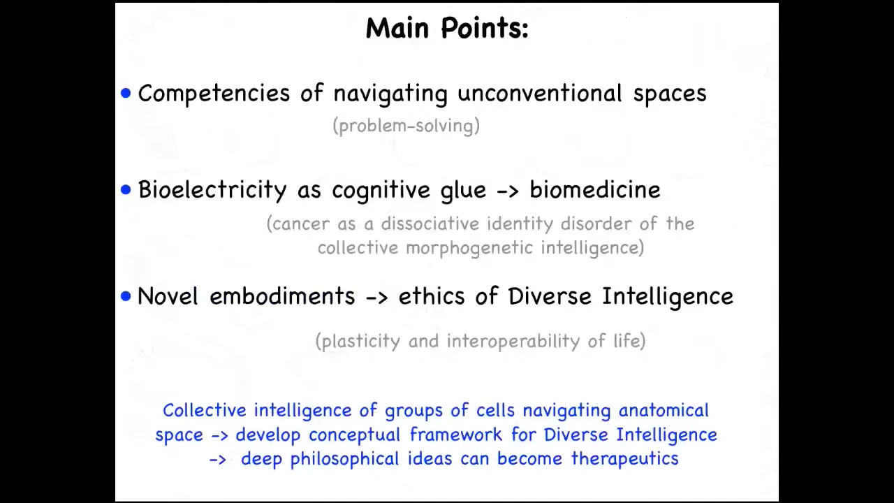 I will talk about a particular example of this unconventional intelligence, which is the idea of non-neural cells using familiar electrical communication pathways as a cognitive glue to give them the ability to solve problems in anatomical space. I will talk about specific applications of this idea to show that this is not just a philosophy or wordplay, but it leads to some interesting biomedical approaches. I'll talk briefly about cancer as literally a dissociative identity disorder of this somatic intelligence.