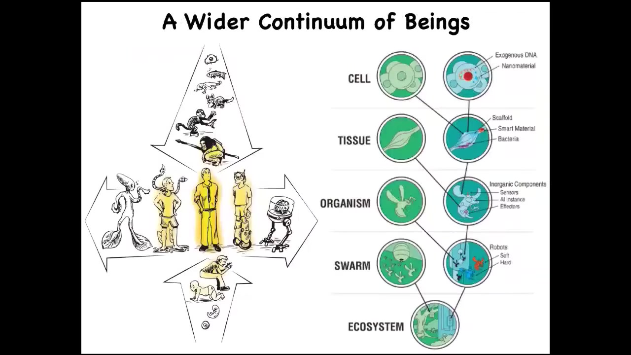 And now with synthetic biology and bioengineering, we know that there's another continuum here, which is that through both engineering and engineered components and biological modifications, we can make some very unusual hybrids that ask us to develop tools to understand what is the cognitive world of beings that are really quite different from what we're used to. And that's because life is very interoperable and at every level of the hierarchy, we can introduce engineered components and make something that has never existed before.