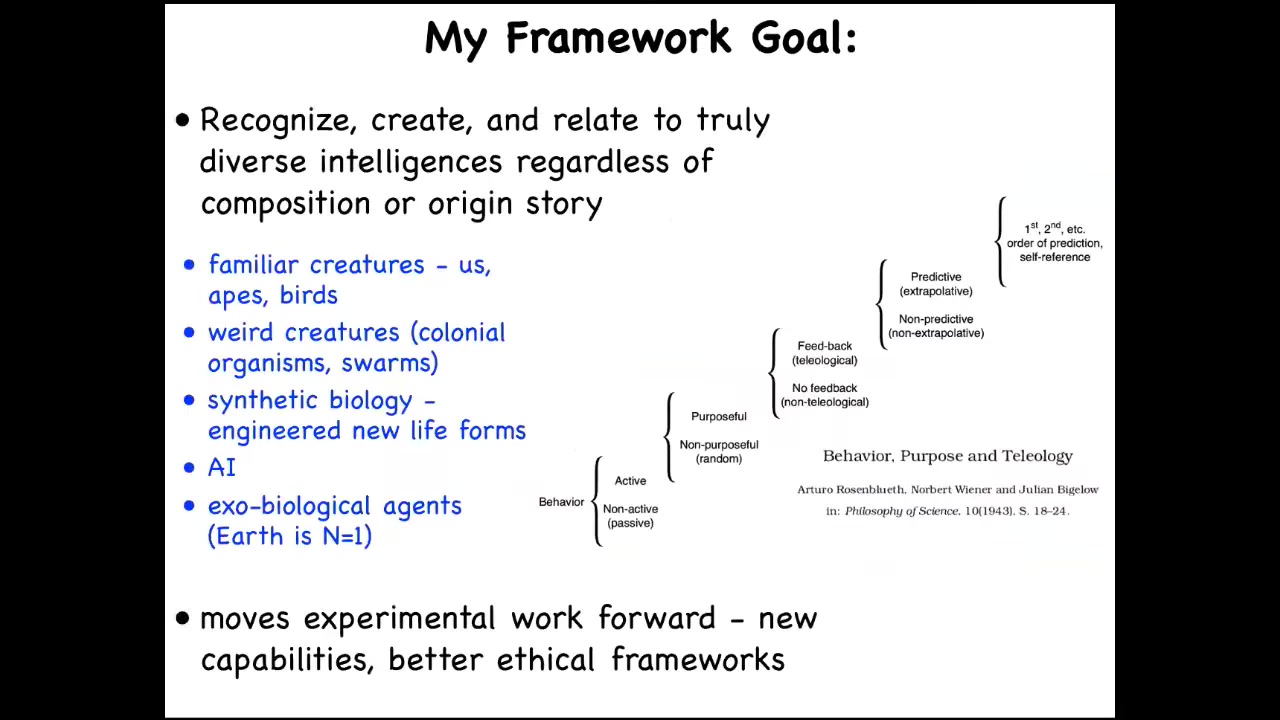 This includes the familiar kinds of things: apes and birds and maybe a whale and an octopus and insects, and then colonial organisms and swarms and engineered new life forms and AIs, whether purely software or embodied robotics, potentially exobiological agents at some point, some kind of alien life. How do we think about all these things? What do they all have in common? I'm not the first person to think about this.