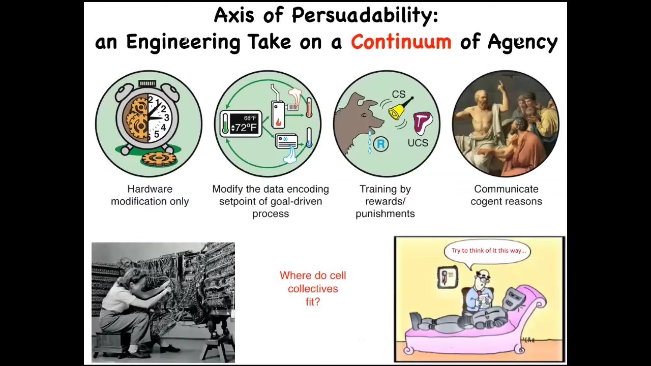 One of the critical things, I think, in this field is that we can't just have philosophical feelings about where things land on the spectrum. We have to do experiments. When we ask where cellular collectives fit on this kind of spectrum, I call it an axis of persuadability, specifically because from the perspective of an engineer the question is, how do we get the system to do something that it wasn't doing before? That is how we make these ideas very practical.