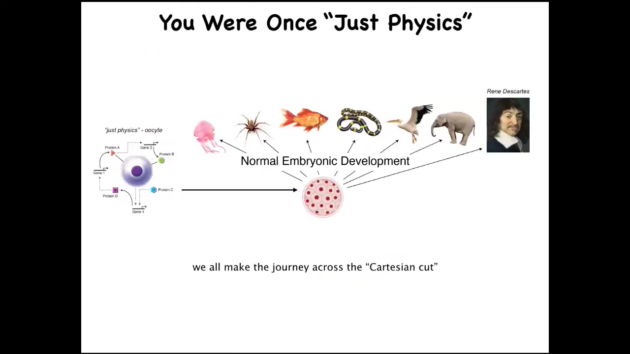 And part of it is that we all started life as a single cell. It's a little BLOB of chemistry and physics that becomes one of these things, or even perhaps something like this. And the one thing we learned for sure from developmental biology is that there is no sharp dividing line that turns physics and chemistry into mind. You're not going to find any specific stage at which suddenly things take over. So we know that what we're really looking for in the science is some kind of principled set of models about the scaling of whatever competencies these things can do up to what happens here. How do they arise both evolutionarily and developmentally? People often see this and say we somehow develop from a single cell, but at least we're a unified mind.