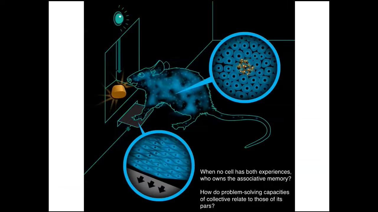If you have this rat that learns to press a lever and get a reward, the cells at the bottom of the foot are the ones that experience the lever; the cells in the gut experience the sugar. Who is it that owns the associative memory that these things are connected? No individual cell had both experiences. There has to be a rat that is in some way the owner of information that none of its parts have. We're interested in how the problem-solving capacities of these collectives relate to those of their parts.