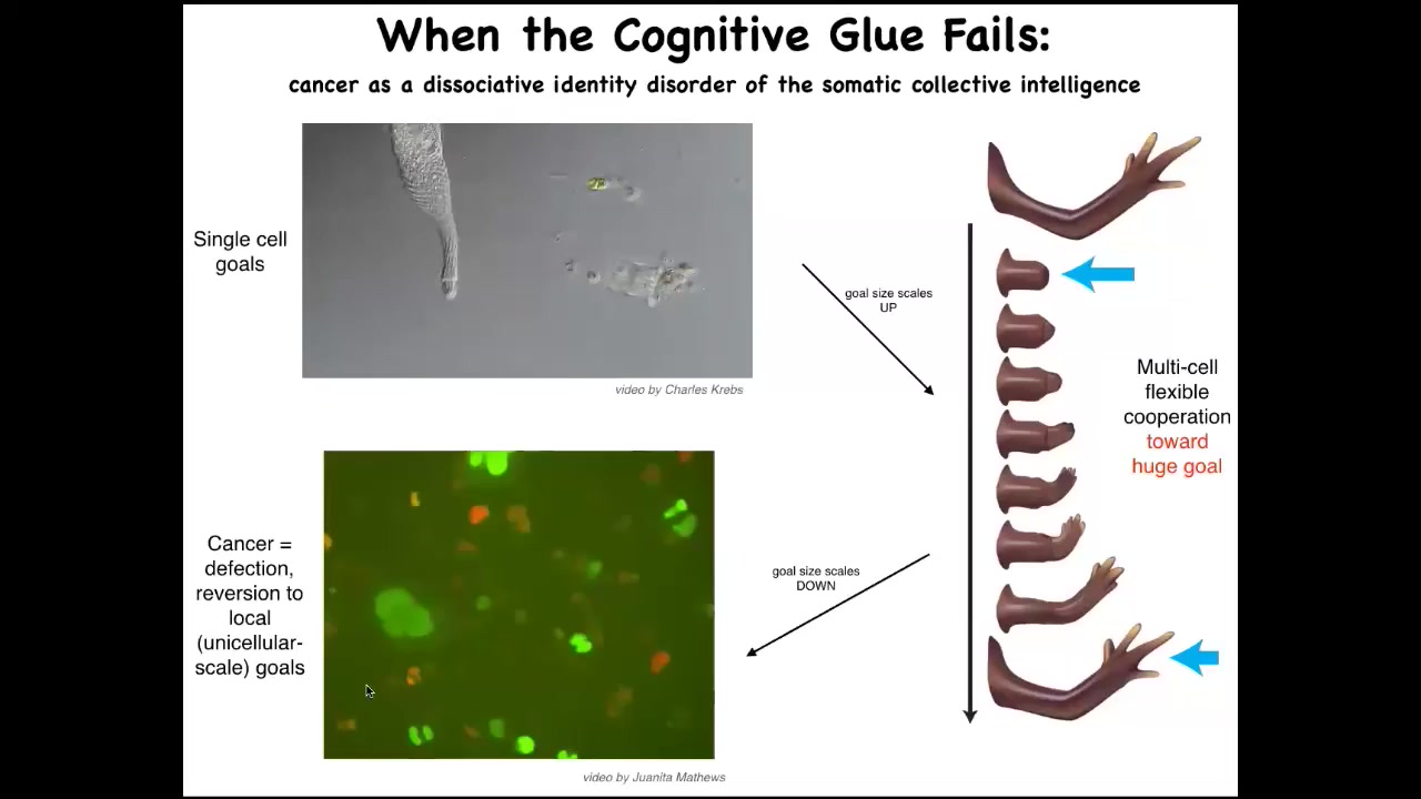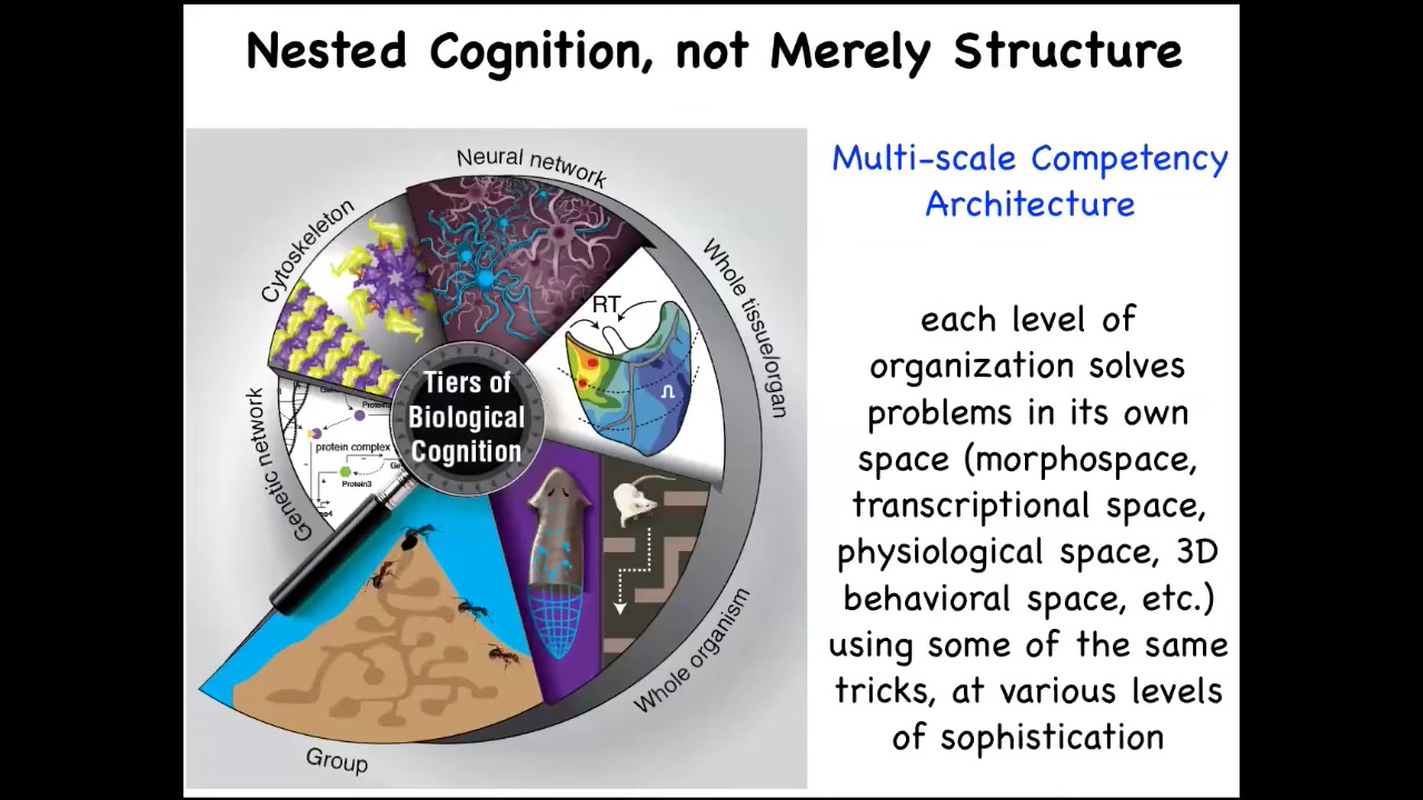 My final point is that when we're talking about biomedicine, where the rubber hits the road with these discussions of intelligence — is it a category error to think about intelligence in non-brainy systems? To me, as an engineer, I judge all of this by how much utility you can squeeze out of it. And if we can use the tools of behavioral and neuroscience to achieve new capabilities in regenerative medicine and cancer, then I think we're on to something. If we take seriously the idea that the body has a multi-scale architecture where the different pieces have different competencies on the scale, we have lots of new kinds of approaches.