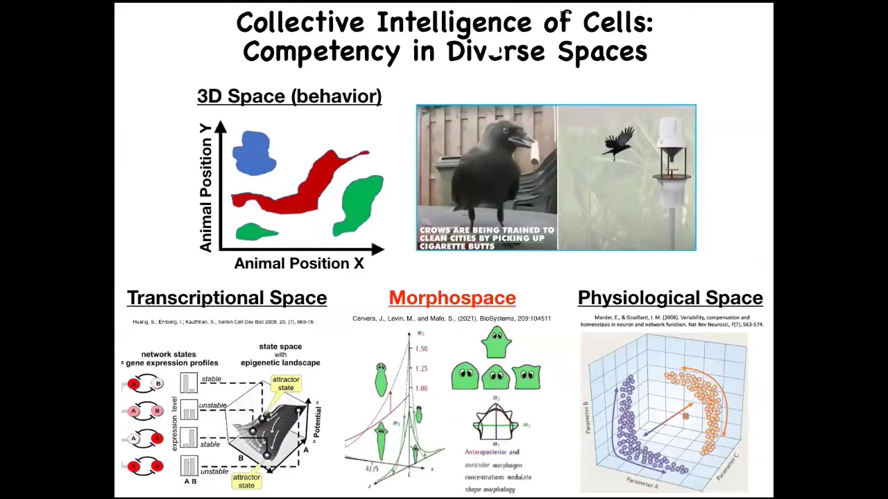 I think it's important to understand that while we, because of our sensory apparatus and our lifestyle, are very preoccupied with specific scales of space and time, and also with three-dimensional space, there are other spaces in which other types of agents live. They operate in those spaces, they solve problems, they perform a perception-action loop. They have goals that they meet with some level of competency, and these include spaces of gene expression, spaces of physiological state, and anatomical morphospace. I could tell you some amazing stories about cells navigating and solving problems in these spaces, but I won't have time to do that today. So I'm going to focus on anatomical morphospace.