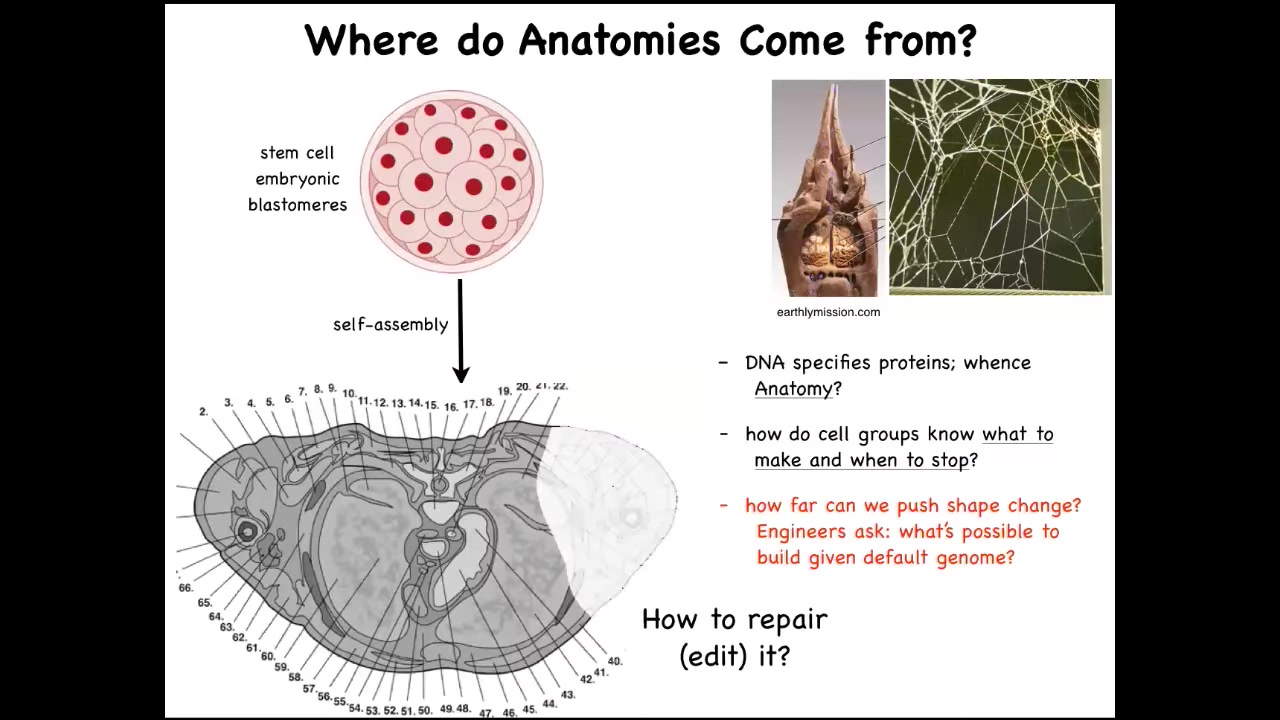 So where do anatomies come from? We all start life like this, as a set of embryonic blastomeres. Eventually, this is a cross-section through the human torso. Look at the incredible order here. All of these complex parts, everything is in the right place, in the right orientation relative to the right neighbor. Where does this pattern actually come from? You might be tempted to say DNA. Most people at this point say genome; it's in the DNA. But of course, we can read genomes now, and we know that the spatial structure is not explicitly in the genome at all any more than the shape of a termite mound or the shape of a spider web is in the genome of these creatures. It's an emergent feature of the physiology and the behavior of these cells. So we need to understand how the cells, with the hardware that the genome does encode — and the genome obviously encodes the tiny protein hardware that every cell gets to have — and the functional software that then describes the behavior of these cells: how do they know what to build? How do they know when to stop? As engineers, we might also ask, how far can we push this process? My lab actually does a lot of work on synthetic morphology. I'll show you a tiny bit at the end, but it's quite remarkable what cells with a perfectly normal genome can be convinced to build. And as workers in regenerative medicine, we'd like to know how we repair. If something is missing or damaged, how do we convince the cells to build something else?