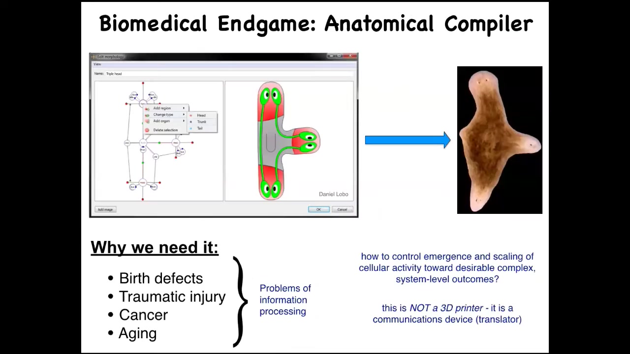 Complete control over growth and form. This is a very practical concern because all of these things—birth defects, failure to regenerate after injury, cancer, aging—would go away if we knew how to convince a group of cells to build something very specific, whatever it is that we wanted. Keep in mind, this is not meant to be a 3D printer. This is not about micromanaging the cells. This is about translating. It's basically a communication device to translate our anatomical goals into those of the cellular collective.