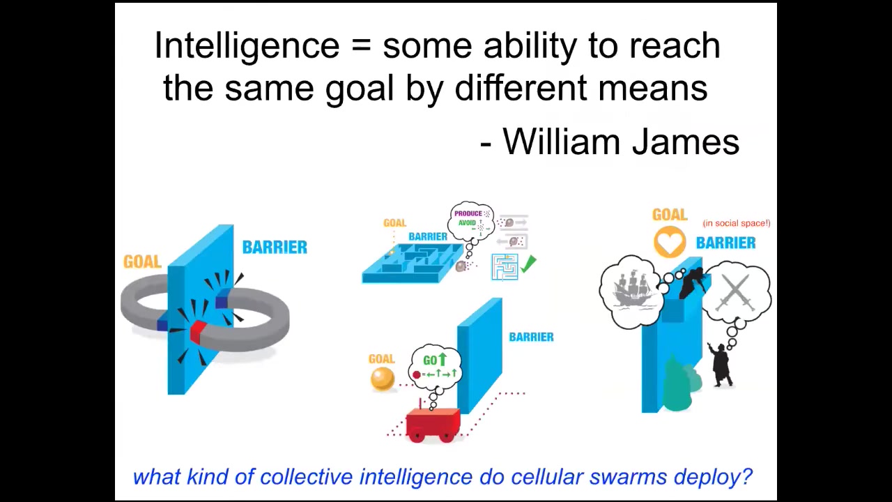 When I say intelligence, what do I mean? I'm going to restrict it to there are many components to this and many people have other definitions. I'm just going to focus on this one way of thinking about it, which is William James's idea, which is that it's the ability to reach the same goal by various means.