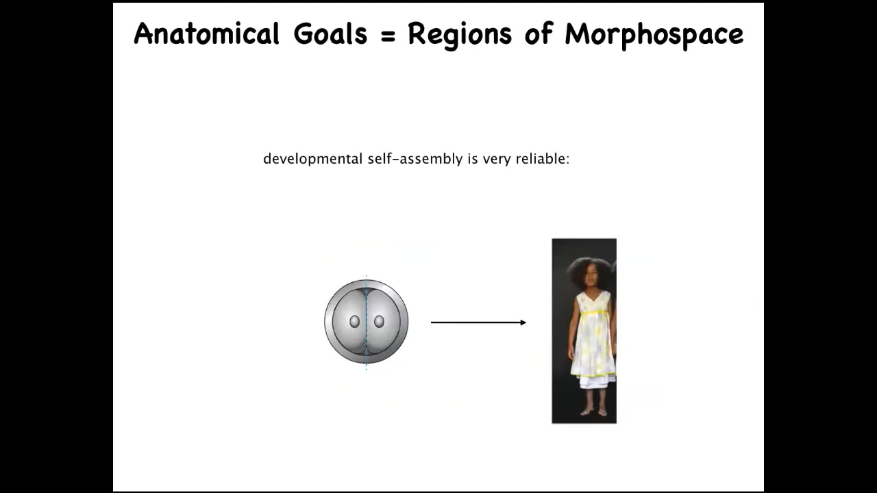 Development starts like this and ends up like this. If you think about the space of all possible anatomical configurations, what you have here is a long journey to a very specific ensemble of states that corresponds to the normal human target morphology. The first thing we know is that this is very reliable.