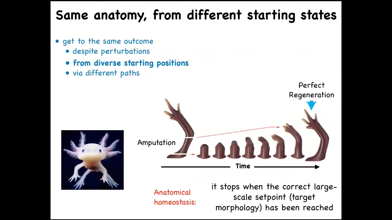 But you can see what happens in animals that retain this ability throughout their lifetime, like this axolotl. It has this limb, and you can amputate the limb anywhere you want. They will grow exactly the right amount. They'll do the complex patterning, lots of cell proliferation, and then they stop. The most amazing thing about regeneration is that it knows when to stop. When does it stop? It stops when a correct salamander arm has been completed. These animals can regenerate their eyes, their jaws, their tails, ovaries. What you have here is the ability to get to the same outcome from different starting positions, despite various kinds of injury.