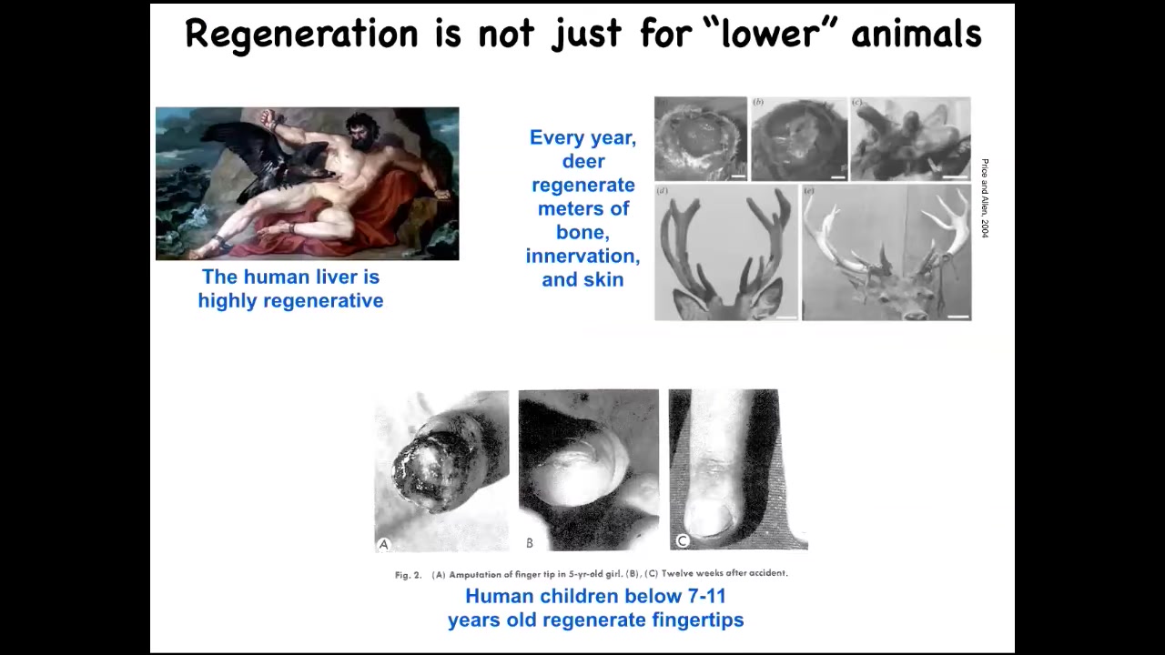 Humans and other mammals can do this. We regenerate our livers; deer regenerate antlers at the rate of a centimeter and a half of new bone per day. Really remarkable. This is an adult mammal doing this. This is to say that what I'm going to show you isn't just about frogs and worms, because that's what I'm going to focus on. Even human children can regenerate their fingertips. This ability to get to the correct target morphology when you've been deviated from it by injury is not the end of the story.