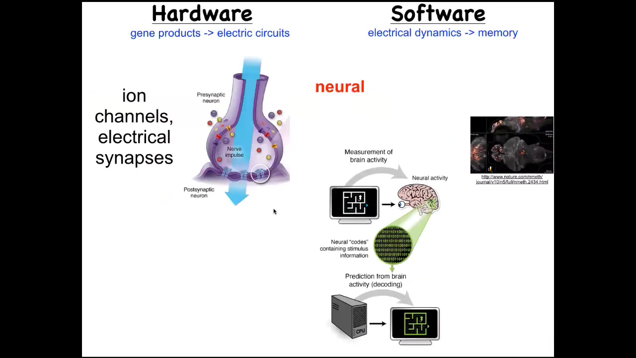 We took a lot of inspiration from neuroscience. The idea that neural decoding is this commitment to the idea that the memories, preferences, goals, behavioral repertoires of a system can be read out from the electrophysiology of their brain. If we understood how to decode these patterns, we would know. This is a living zebrafish brain that this group imaged. If we knew how to decode these patterns, we could understand the behavior and the mental life of this creature. This is an amazing system that uses electrical communication between cells to process information in the service of behavior and specifically goal-directed behavior that animals can do.