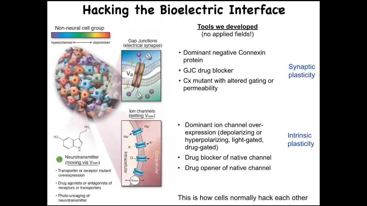 We don't use any applied electric fields. There are no waves, there are no frequencies, there are no electrodes, no magnets. We do exactly what neuroscientists do, which is that we target either the topology of the network by opening and closing specific gap junctions, or we can target the actual electrical state of these cells by controlling the ion channels. We're talking about drug-based openers and blockers, genetic mutation of channels, optogenetics.