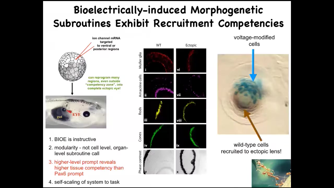 The last thing that I find amazing about this is that this is a lens sitting out in the flank of a tadpole somewhere in the tail. What you'll notice, the blue cells are the ones that we injected with our potassium channel. All of these other cells up here were never injected. What's happening here is that there's not enough of these cells to build an entire eye. What they're doing is recruiting their neighbors to help them complete the process. That competency, we didn't have to put that in. The ability of these cells to do a secondary instruction—so we tell you, "make an eye," and they tell their neighbors, "you have to help us make an eye"—is something that we see in other collective intelligences like ants and termites when the colony scales its efforts appropriate to a task of carrying a large food item. This is all part of what the material can do.