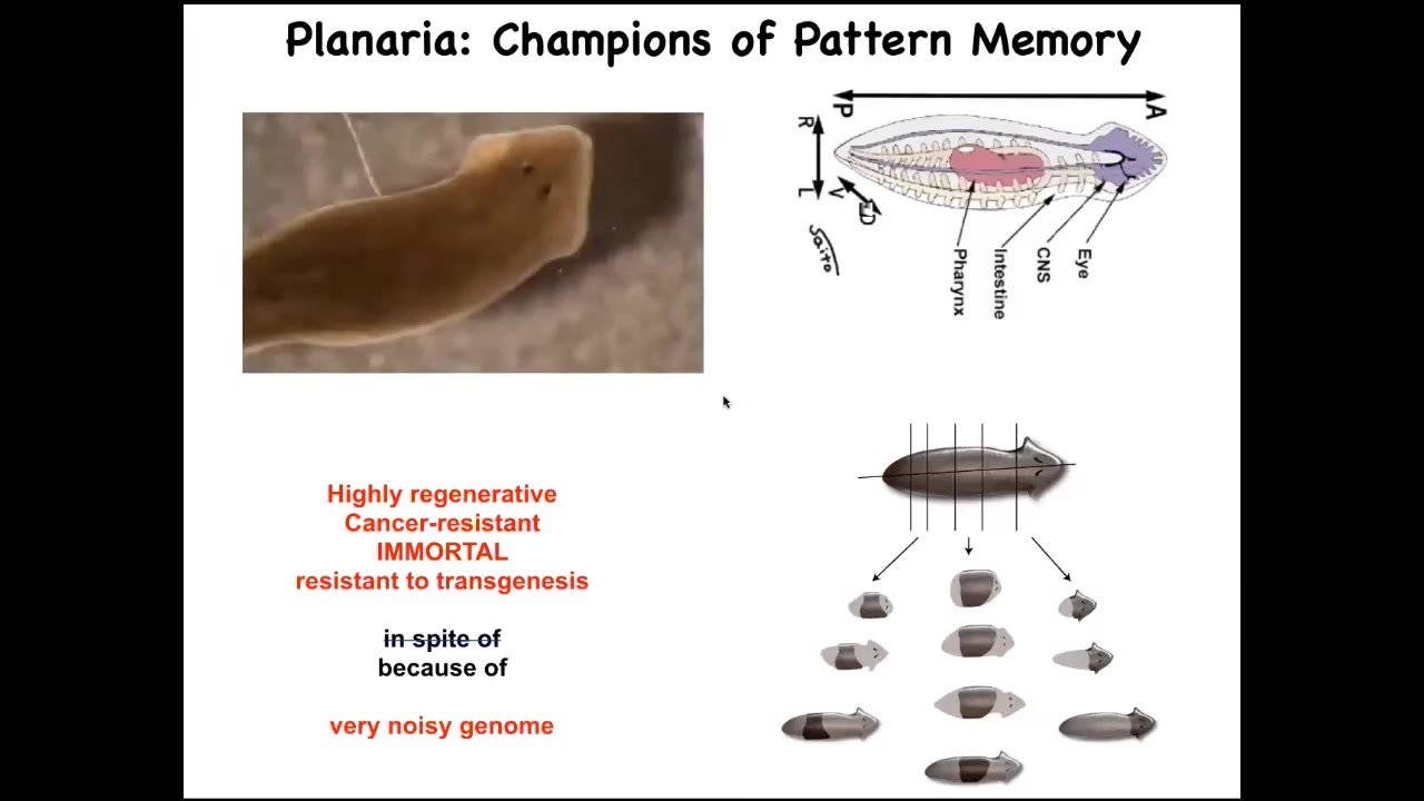 I want to show you one other example of an animal that lets us see how much we can import from ideas in neuroscience. This is a planarian. These are flatworms that regenerate. They have some amazing properties, but they're highly regenerative. They're also cancer resistant. They're immortal, if no aging occurs, and they're extremely resistant to transgenesis. And I think that's because of their incredibly noisy genome. But one of the amazing things is that when you cut it into pieces, and the record is 276 pieces, each piece gives rise to a perfectly normal worm, and it has the right number of heads and tails.