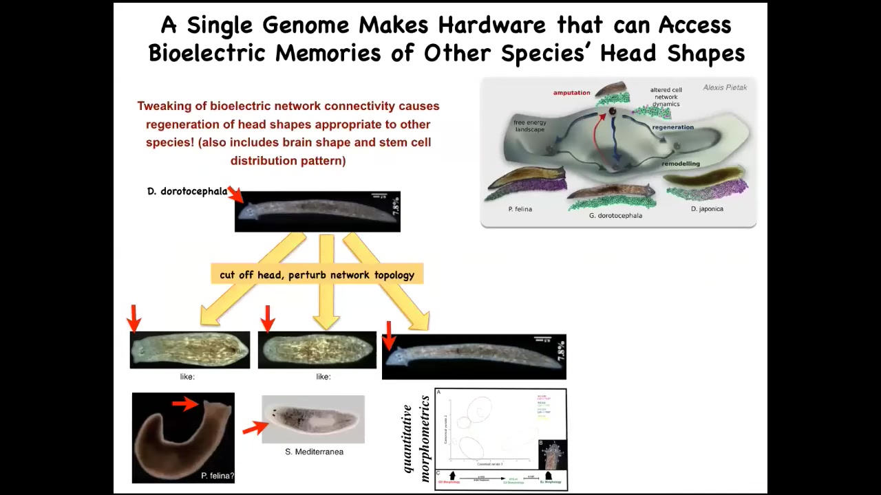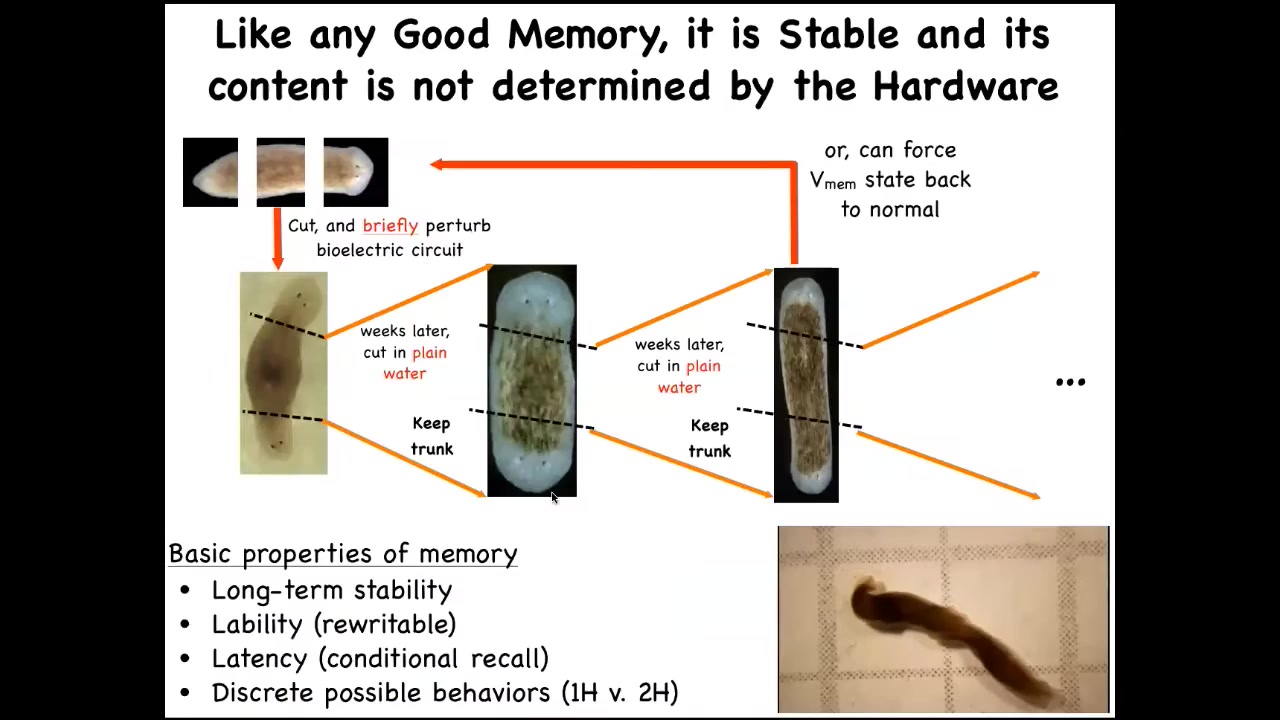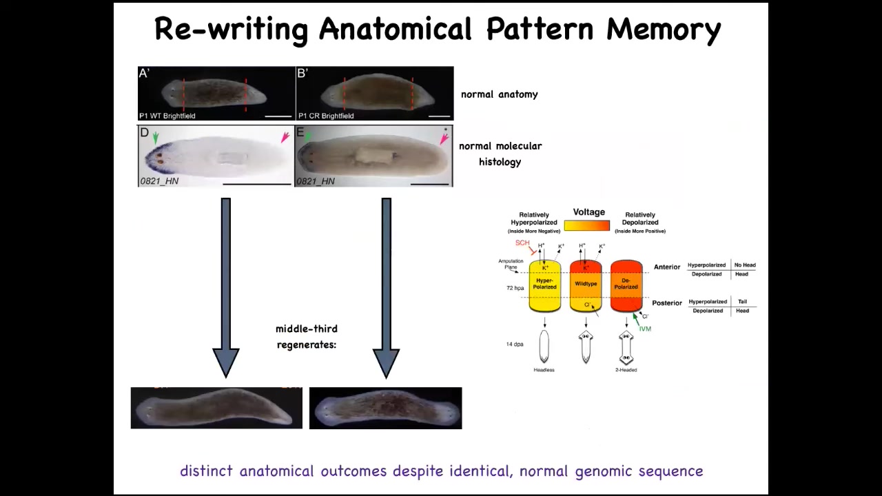 Another reason I call this thing a pattern memory is this remarkable result, which is that if you make a two-headed worm and then you cut them again in plain water, they continue to regenerate two-headed in a two-headed way. There is no genetic change here. We're not touching the genome. We're not reprogramming at the genetic level. We have altered, through a physiological experience, the set point that guides the movement of the regenerative process in their navigation of space. And it will continue to — that electrical circuit holds. As long as we don't set it back, and we now know how to set it back, it will continue to hold. This system has all the properties of memory. Not in physical space, in anatomical space. It's long-term stable, but it's rewritable. It has a conditional recall. It's got discrete possible behaviors, so one head versus two. The individual cells aren't doing discrete things. It's the group, the collective. The individual cells here aren't confused as to whether there should be part of a head or a tail. The collective makes a decision about where it's going to go. Not only can you convince the system to permanently take up a different set point for the number of heads, you can do the same thing for the type of heads, and you can make them have heads of other species.