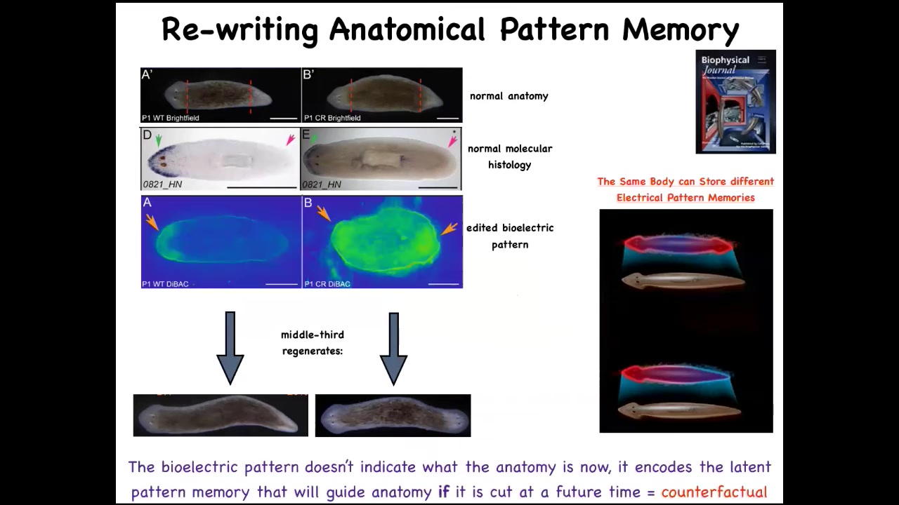 Not only is it a pattern memory that serves as the set point, but it is actually a counterfactual memory. It is a very primitive example of a kind of mental time travel where brains can remember things that aren't true right now and anticipate things that also aren't true right now. This state of affairs is not true right now. For this animal, the anatomy is normal, the gene expression is normal, but this is what it stores: what am I going to do if I get injured in the future. We now know that the body of a planarian can store at least two, no doubt more, but we've nailed down two representations of what the target pattern is going to be if it should happen to be injured in the future.