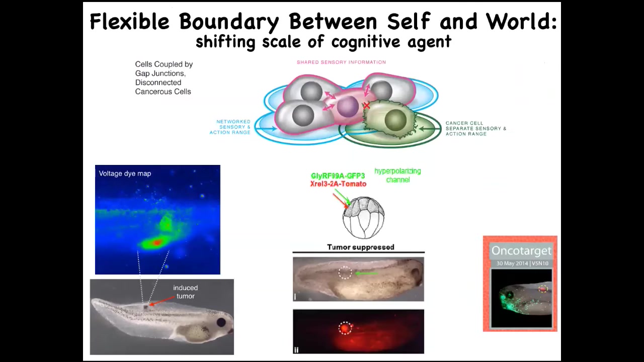 So that leads to a really different way of thinking about cancer, not as a genetic disorder of a broken genome but as a failure of maintaining the properly sized boundary between self and world — the scaling of where do I end and the outside world begins. Thinking about it in this way suggests a very specific therapeutic. Once you have an oncogene here, the first thing these cells do when the oncogene is expressed is they depolarize and cut electrical connections with their neighbors. At that point, they can no longer remember what they're supposed to be building, and that's it. Then you get metastasis.