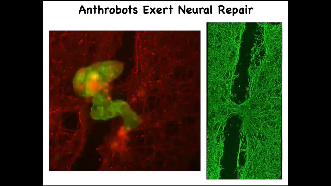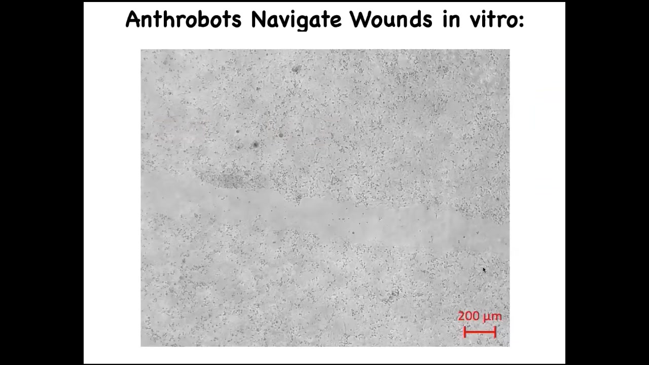 Here's one. If you plate human neurons here on this dish, and then you make a scratch, so a wound through this neural layer, here it is. So these anthrobots traverse it.