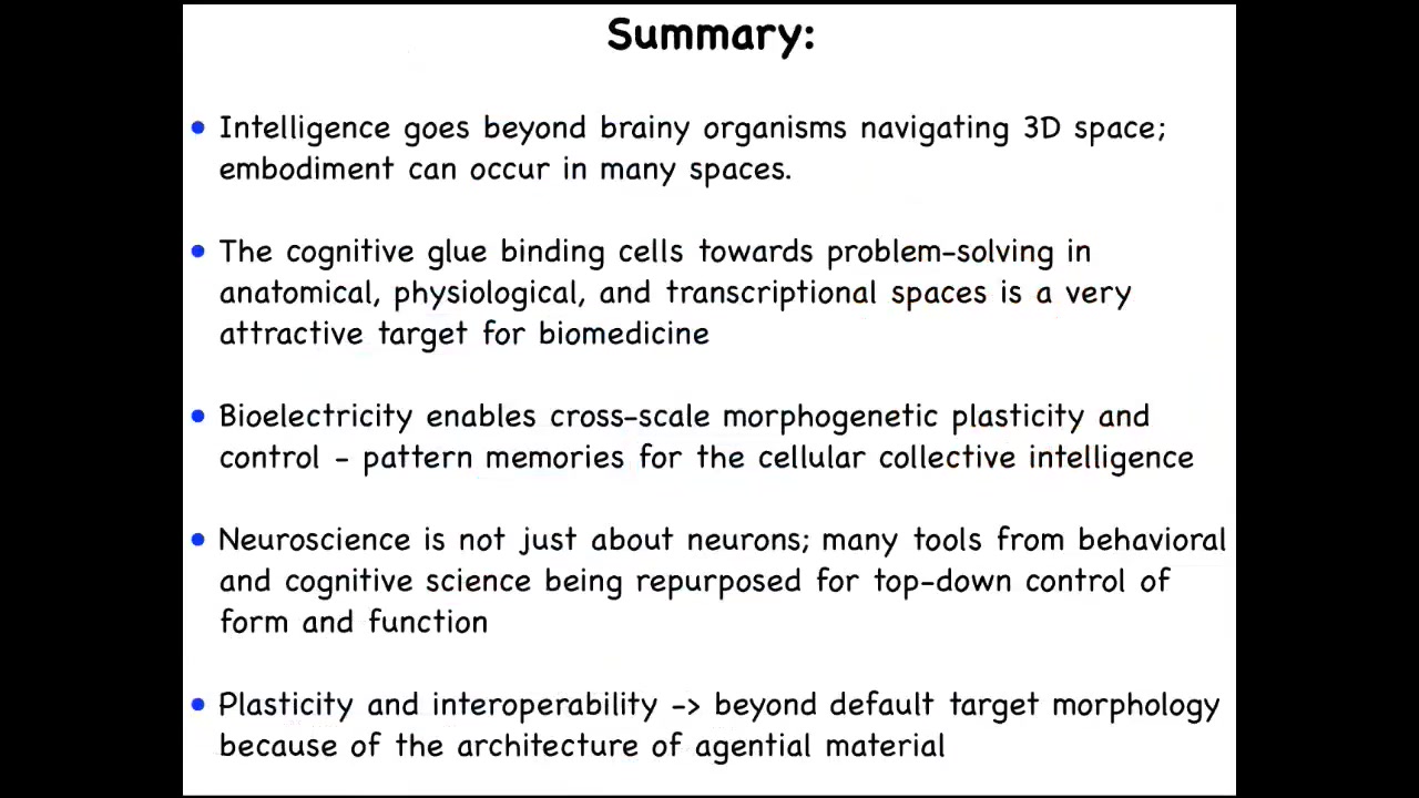 I think it's important to consider that intelligence can be deployed in many different spaces besides our familiar 3D space, that there's an attractive target for biomedicine in the mechanisms that bind cells together towards goals in higher scale spaces. Bioelectricity is a key element of this. I really think that the major, the deep ideas of neuroscience are not about neurons at all, and they have to do with cross-scale kinds of dynamics, problem-solving dynamics that evolution exploits at every level of structure. If you're interested in any of these things, there are lots of papers on this where I go into detail.