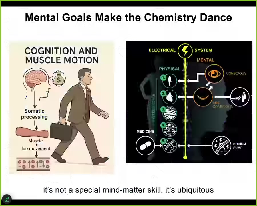 I want to point out something that is often forgotten. When you wake up in the morning, each of us may have very abstract, high-level goals. You may have financial goals, social goals, research goals. In order for you to get up out of bed and execute on those goals, charged molecules like calcium and potassium have to cross your muscle membranes. The chemistry has to dance to the tune of a very high-level, abstract mental goal. How does that happen? How is the chemistry of your body, the actual molecules of your body, controlled by your thoughts and your intentions? This is not a special mind-matter interaction that is only accessible to yoga practitioners or special masters. This is everyday voluntary motion. Our bodies are constructed in a way that can transduce these extremely abstract mental objects, like goals, all the way down to the act of chemistry changing in your cells.