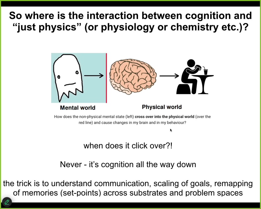 You might want to ask: this interaction between the mental and the physical, where does it happen? Where is the interface between cognition and the contents of our mind and so-called just physics or physiology or chemistry? Where and how do our thoughts actually affect the physical world? When does the mental become the physical? When does it turn over? What I'm going to suggest is the answer is never. It's cognition all the way down, all the way from a high-level mind embodied in human bodies and whatever is beyond that, all the way down to molecules. That's the answer to this puzzle of the interaction of the mental world and physical world. It is mental all the way down.