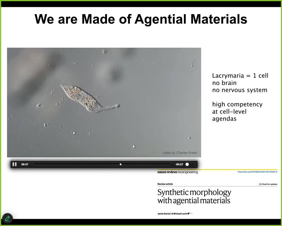 We are made of these agential materials. That is materials with an agenda, materials with competencies. There's no brain here. There's no nervous system. You can see this incredible creature and the competency that it has in its environment. One might wonder, how is it that we could engineer with materials such as this? It's completely different than how we used to do it with wood and metal and Legos, because you can't micromanage this. You have to convince it to do things.