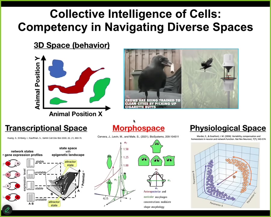 And that's because all throughout the history of life, biology has been solving problems in many, many different spaces besides the three-dimensional space of which we are so familiar. So we can recognize birds and primates and maybe an octopus or a whale or things like that as intelligent. But long before we had brains, long before we had muscles that allow us to move in three-dimensional space, biology was navigating the space of possible gene expressions, the space of physiological states, and the space of anatomical states.