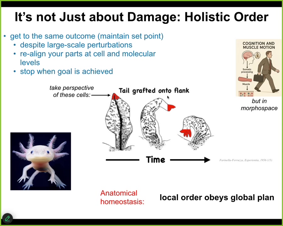 What happens is that if the limb is amputated anywhere along the length, the cells spring into action and will immediately regenerate and regrow the same pattern and then they stop. The most amazing part is they know when to stop. When do they stop? They stop when the correct axolotl limb has been completed. So it has the ability to know when it's been deviated from its goal and then to work really hard to get back to that same position in anatomical space. It's the ability to reach the same goal from different starting positions. That's pretty impressive.