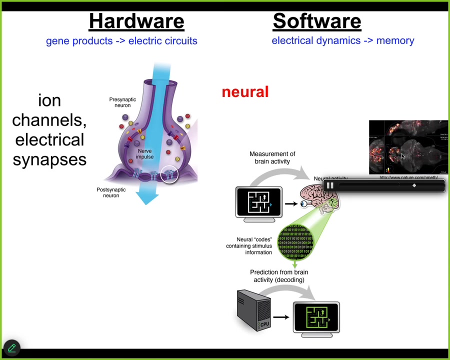 We have an idea of how this works. The brain consists of many cells, which have these little ion channels on them. The ion channels allow the cells to have a voltage gradient. That voltage is communicated through these special electrical synapses. You can see here a video that this group made of zebrafish brains thinking about whatever it is that zebrafish think about. You can track it and try to decode it. This is the idea of neural decoding to try to understand what are the memories, the goals, what is encoded in this electrophysiology.