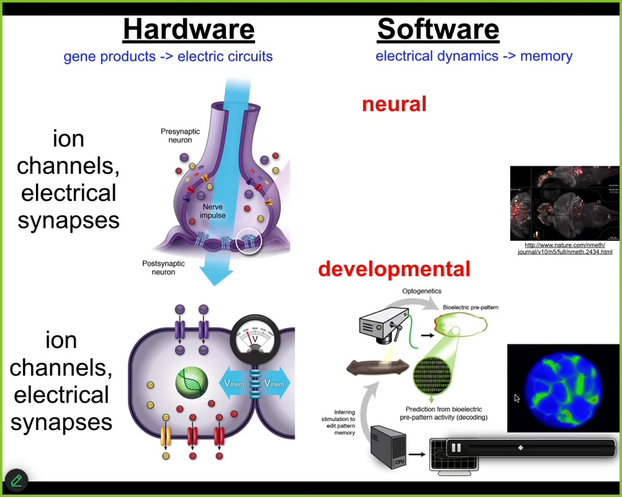 The ability to store mental content in electrical networks and propagate it down to activity is extremely ancient. Biology discovered this long before we had brains or muscles or nerves. Every cell in your body has these ion channels and creates electrical gradients. Most cells have electrical synapses to their neighbors so they can communicate with them and create networks with large computational capacity. We can do something very similar to what neuroscientists try to do in the brain, and that is to decode.