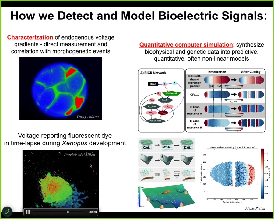 We created some tools to do this, to read and write the memories of the body. First, these voltage-sensitive fluorescent dyes. This is a technology to non-invasively read the electrical communication between cells. You can see that here in individual cells, and this is an entire embryo. We also do a lot of computational modeling to try to understand quantitatively how this works.