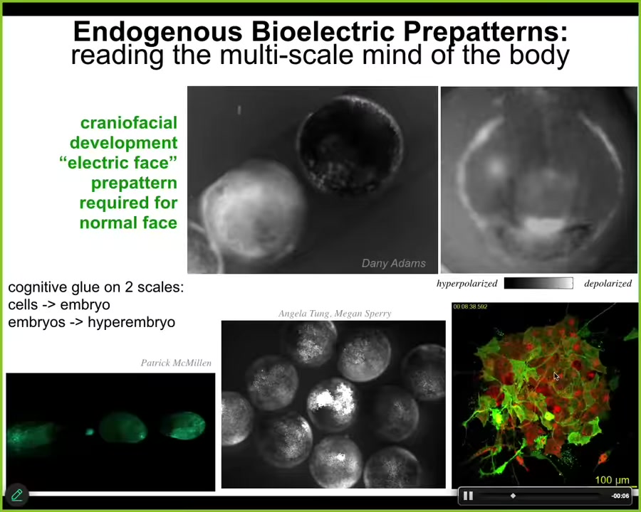 I'm going to show you an example of several kinds of patterns. We call this the electric face. Here's an early frog embryo in a time lapse. The brightness indicates voltage. This is one frame of that video. You can see that already long before the organs of the face were specified, the electrical pattern set the future as a scaffold. You can see here's where the eye is going to be, here's where the mouth is going to be, here are some placodal structures outside. This is how it knows what a correct face looks like. We are literally here looking at the decoded electrical memory of the tissue of what a proper tadpole face is supposed to look like. It's not just single embryos; each one of these big circles is a different embryo, and they communicate with each other. When I poke this guy here, there's this calcium wave that goes. The embryos communicate with each other to help each other reach the correct endpoint. Here you can see we can track this among the individual cells.