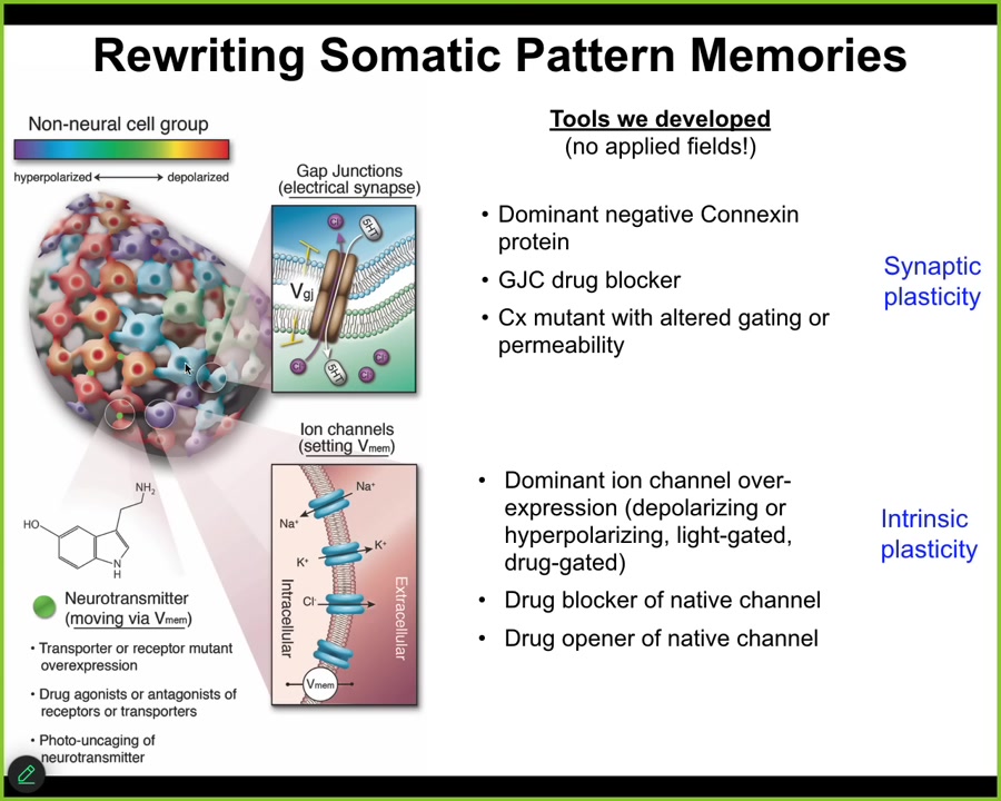 Now it's not enough to read those electrical networks and read the memories that the tissue has. We want to be able to rewrite those memories. We don't use any electric fields. There are no magnets, no electromagnetism, no frequencies, no waves. That is not how we do this. What we do is hack the normal interface that the cells are using to control each other's behavior. That means controlling these ion channels and controlling the electrical synapses. We can do this with all the tools of neuroscience. We can do it with light, with special pharmacological agents or drugs. Now I want to show you one or two examples of what happens when we can rewrite these pattern memories.