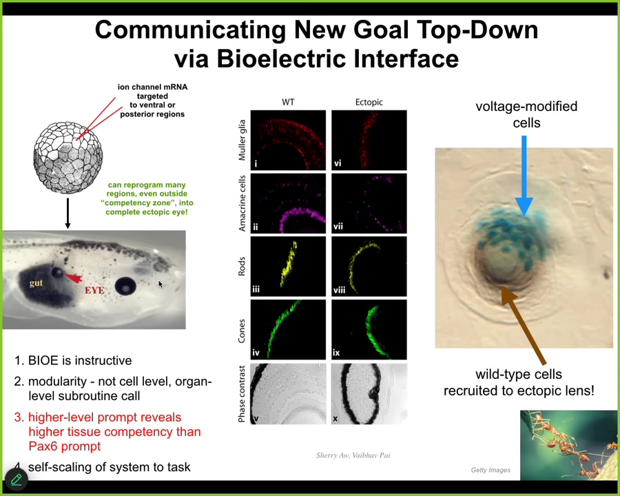 This is remarkable for many reasons. First of all, it tells us that the bioelectric state, which is what we've manipulated here, in fact, is instructive. It tells the tissues what to do. But more importantly, it's instructive at a very high level. We didn't have to tell what genes to turn on and off. This has nothing to do with genetic editing. This is not about controlling specific genes. This is not about controlling stem cells. We have no idea how to micromanage the creation of an eye. What we do know how to do is to say to the very competent tissue, build an eye here. And it takes care of the rest.
