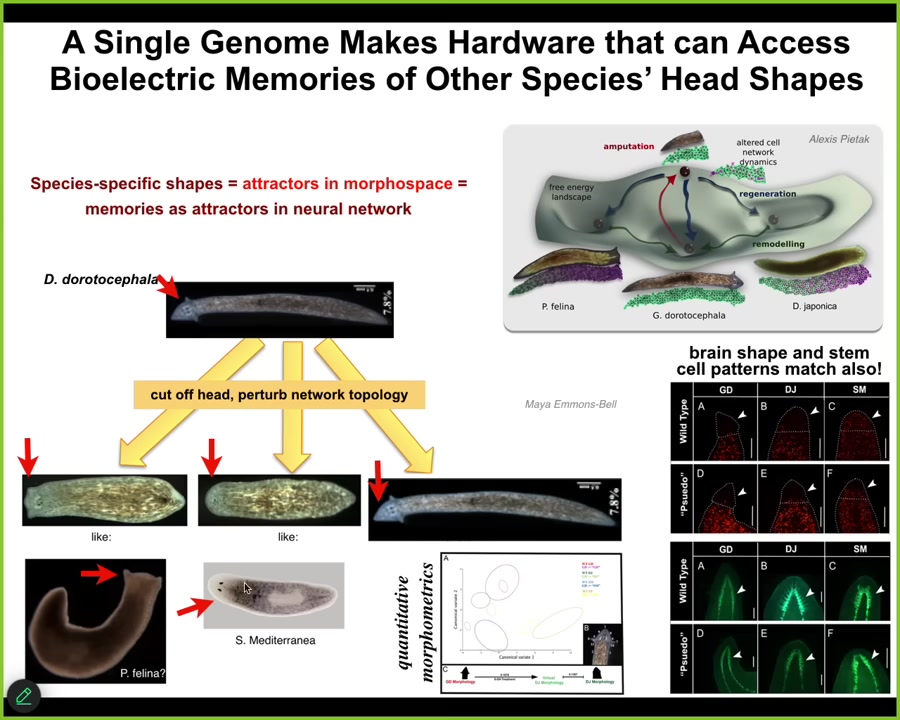 One of the amazing things is that they use an electrical gradient to know how many heads and what kind of head they should have. When we manipulate it, we can make them have their normal heads like this, but they can also make flat heads like a completely different species of planarian, or roundheads, like a different species of planarian. These are between 100 and 150 million years distant from this, but without any genetic change. We don't touch the genome at all. We simply communicate electrically with the cells, and we can get the same hardware, so the same genetics, to visit these kinds of attractors in anatomical space that belong to these other species.