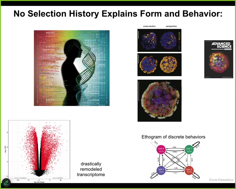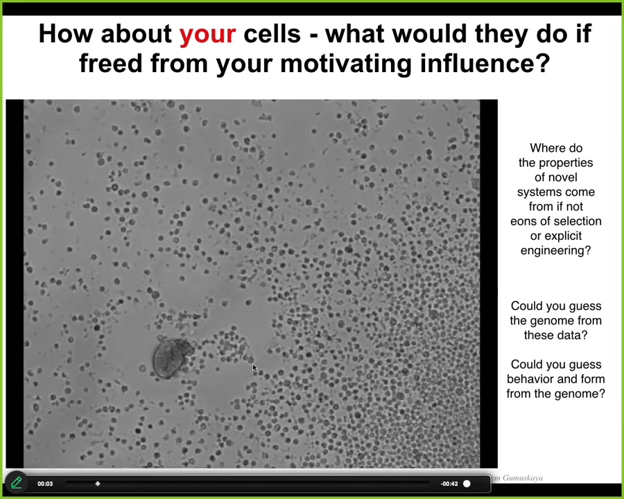 They have the ability to self-assemble into a tiny little creature that swims around. It has a completely different behavior. It doesn't look anything like any stage of human development. The plasticity is amazing. When you free your cells from the influence of the rest of the body, they have a different life. This thing has never existed before. These anthrobots have no evolutionary history. What do they know how to do?