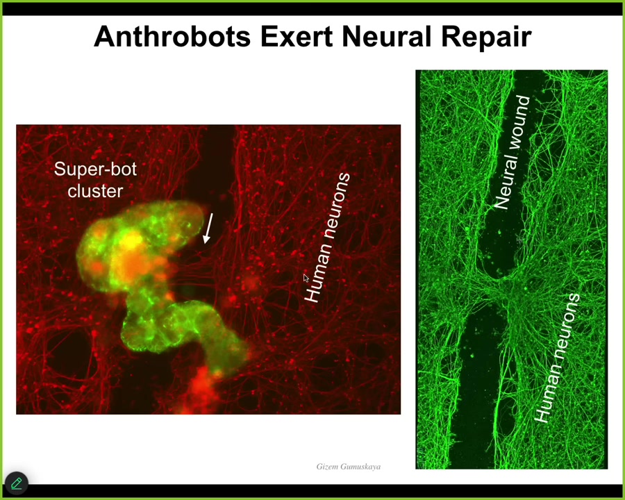 One thing they know how to do is repair damage, for example, in neurons. If you plate a bunch of human neurons here in a petri dish, you take a scalpel and you make a big scratch, a big wound through this. Here's your neural wound. And you put a bunch of these anthrobots labeled in green. They will find a spot in this wound. They will land there. And what you'll see is that they start to knit the neurons across the gap. They start to repair. If you lift them up four days later, this is what they're doing. They're repairing the damage. So who would have thought that your tracheal epithelial cells which sit there quietly for decades dealing with mucus and air particles have the ability to become a completely different little creature.