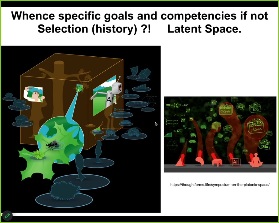 These capabilities—these new gene expressions, new behaviors, new forms, new physiological properties—are not just random things that happen; they are drawn from an ordered, structured space that contains not only mathematical truths, but also high-order patterns that we recognize as kinds of minds. You can see there's a whole symposium that we're running this fall on this Platonic space. This idea is that living beings, but also engineered beings like robots and AIs and hybrid forms and cyborgs, all receive the benefit of the ingressions of patterns from this space. We really need to understand this to take the full benefit of the technologies that are coming.