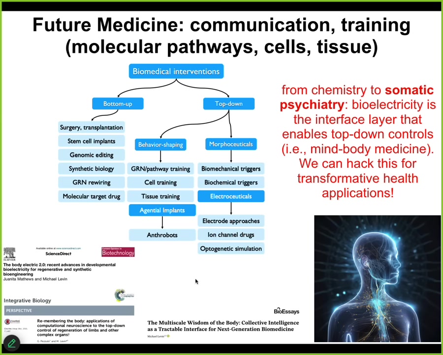 These are all the familiar strategies of biomedicine. They're all bottom up, they're all hardware first. But there are these incredible technologies coming down the line having to do with exploiting the intelligence of the material of life. I think that future biomedicine is going to look a lot more like somatic psychiatry than it's going to look like chemistry. It is about collaborating, cooperating, and convincing your various intelligences in your body to do the things you need them to do.
