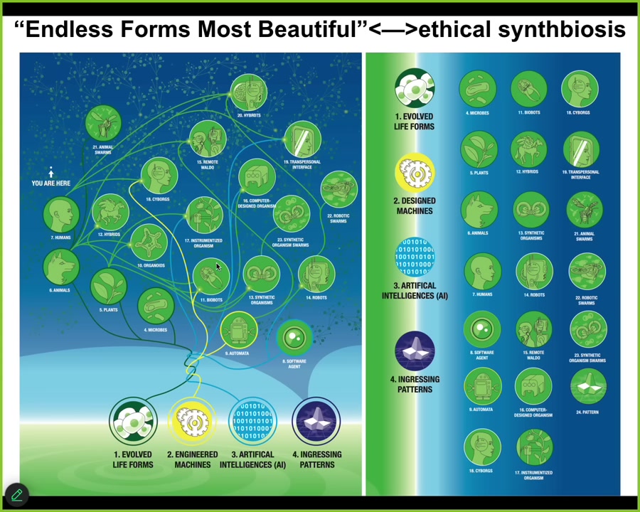 The final thing I'll say is this. Besides all the advances that this is going to lead to in regenerative medicine, cancer, birth defects, bioengineering, there's an ethical and a social component here: all of the natural forms that Darwin meant when he said "endless forms, most beautiful" are a tiny corner of this enormous space of beings. All of the combinations of evolved material, engineered material and software, and the patterns from this space, make some kind of a viable, novel, embodied mind. So cyborgs and hybrids and every kind of combination under the sun is coming. We are already living with many of these beings. Many of these already exist, but there will certainly be more. We need to understand all of these components and develop a novel set of ethical principles to relate to beings that are not like us, that are truly alien, that do not come from our evolutionary life stream. We need to enter into a kind of ethical synth biosis with these beings as a matter of maturing as a species.