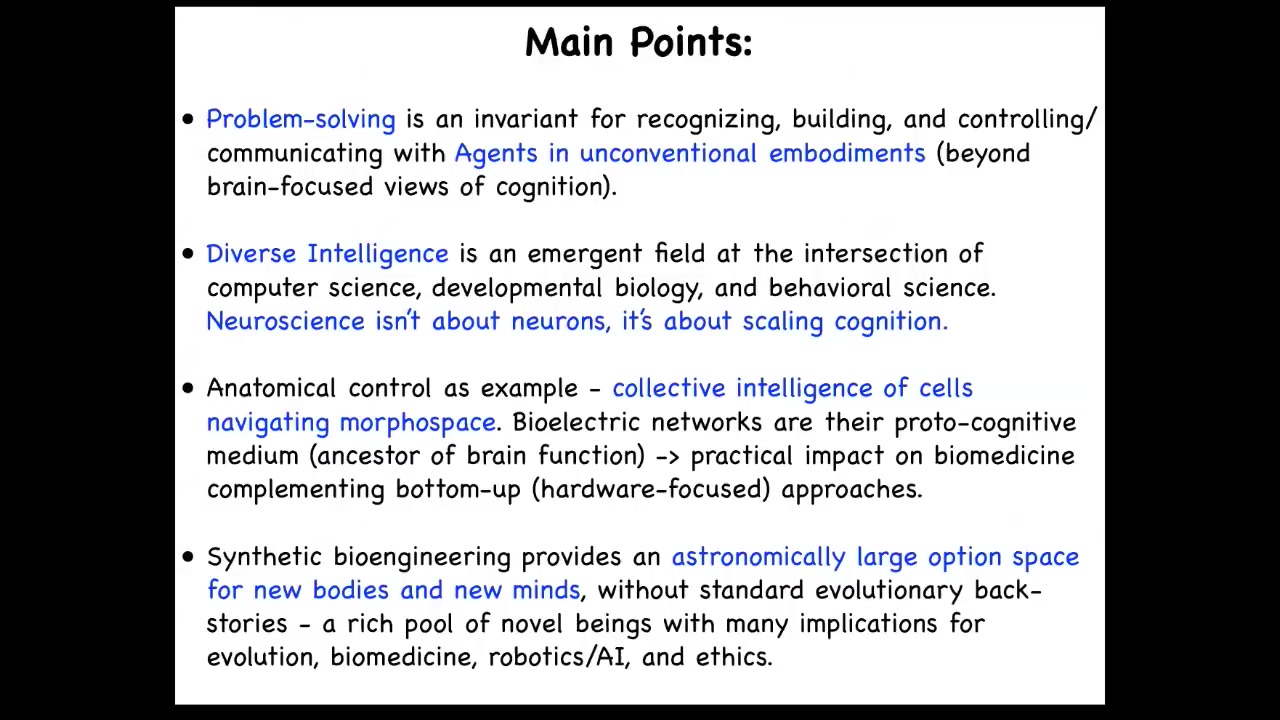 All of this is a contribution to the field of diverse intelligence, which is this emerging area at the intersection of computer science, biology, and behavioral science. Part of the message here is that neuroscience isn't really about neurons. It's about scaling cognition. That has many implications for machine learning and AI that often tries to look at the brain as its inspiration. I'm going to use the control of anatomy as the example of a collective intelligence, specifically the collective intelligence of cells that navigate anatomical morphospace. I'm going to tell you that electrical networks, specifically bioelectrical networks, carry the computational medium of that collective intelligence. This has interesting applications in biomedicine. At the end, I'm going to show you some novel creatures, some synthetic proto-organisms, and talk about a very large option space of new bodies and new minds, which the young people in the audience are going to be living with over the next few decades.