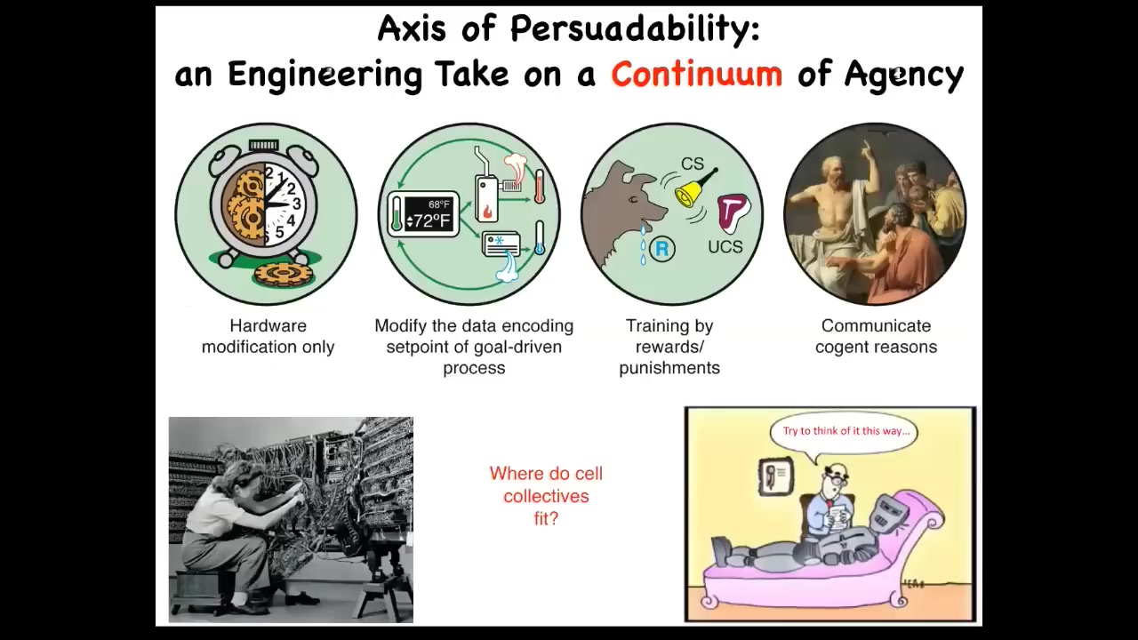 I work with something I call the spectrum of persuadability. It is this idea that there are numerous different kinds of systems, all the way from very simple mechanical ones to homeostats and various kinds of animals and learning devices, and then human and whatever's above that. The idea is that at different places along this continuum, there are different tools that you might use to interact with that system, from hardware rewiring to modifying set points, to learning and training, and various kinds of high-level communications.