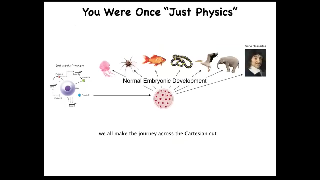 And that's important because all of us made this journey from a single unfertilized egg cell, a quiescent oocyte, to one of these amazing morphologies, even something like this, a human. It's critical to note that this process is smooth and continuous. There is no magic time point or lightning flash that turns the physics and chemistry of the early cell into what you might think of as true cognition; there is no such flip over. All of this is smooth and continuous, and we really have to understand how that scaling of competencies from here to here works. That's already a little destabilizing this idea that actually we slowly metamorphose from a fairly simple chemical physical system, but then at least we're a unified kind of intelligence.