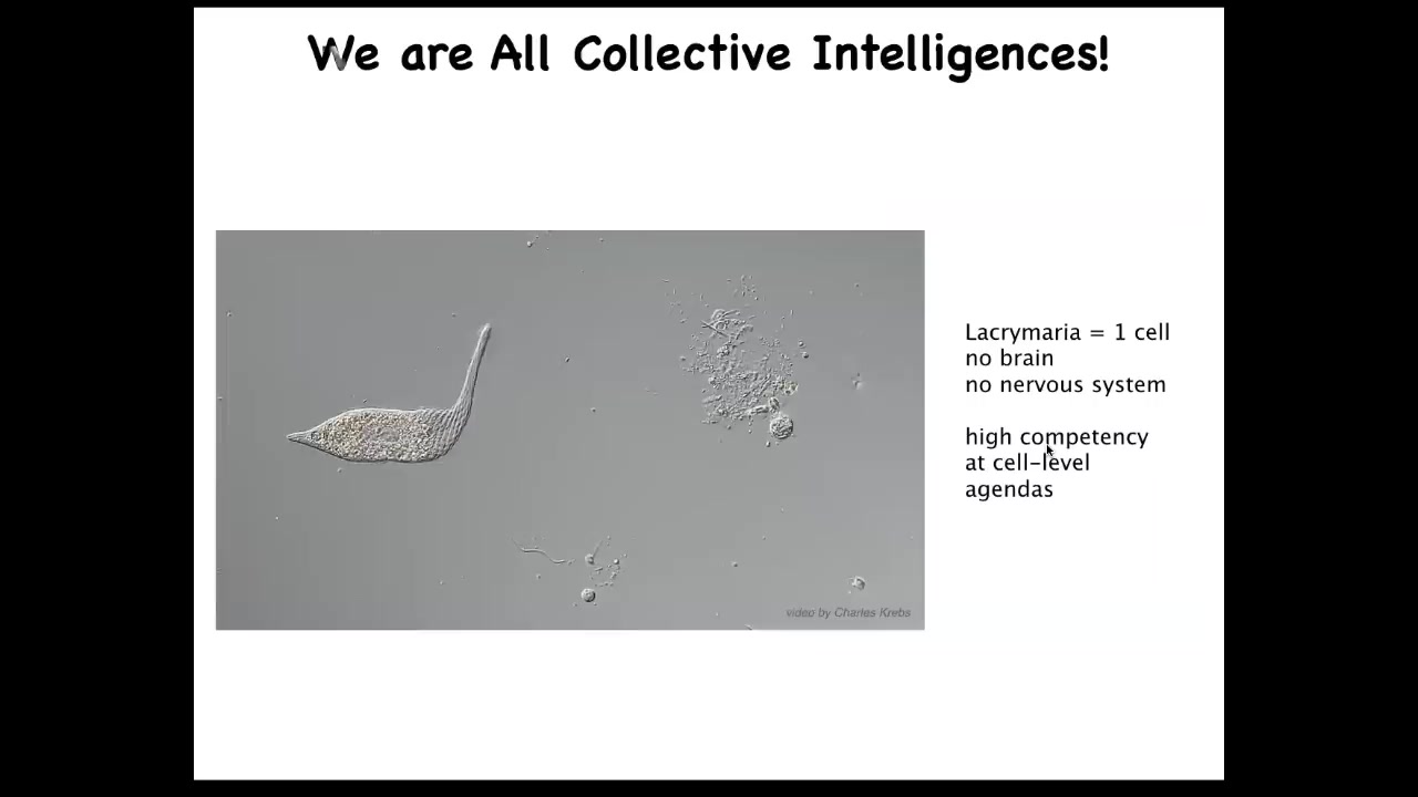 And in particular, we are collective intelligences. We're made of cells, a gentle material. This is a unicellular organism. This is called the lacrimaria. It's one cell, there is no brain, there's no nervous system, but it has all these interesting competencies in problem solving at its own scale. It handles its metabolic, physiological, anatomical goals all on its own.