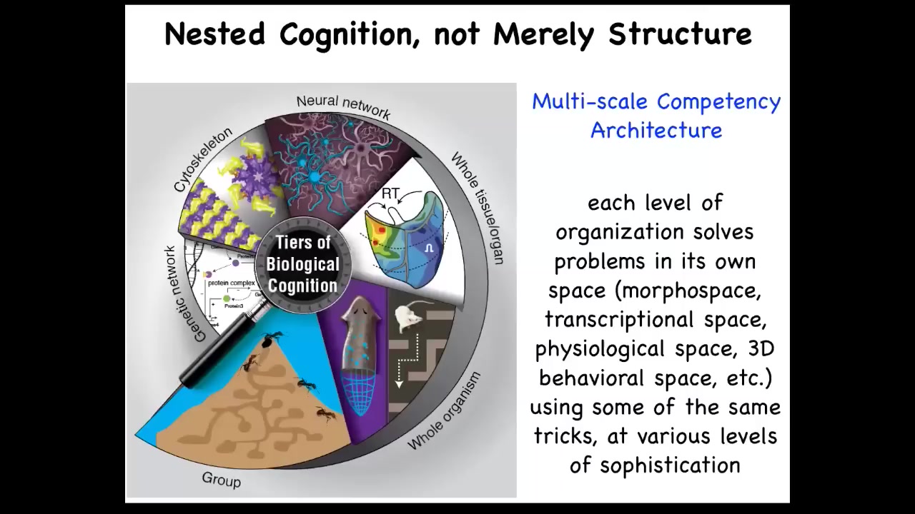 And so our bodies and biology in general are not just physically or structurally nested from molecular networks to cells to organisms and so on, but functionally, we live with a multi-scale competency architecture. Every layer of the body has its own ability to solve problems in different spaces, and they all cooperate and compete both laterally within the layer and up and down through scales to interact. And so we are all this collective intelligence. I want to show you a few unusual examples of biology that you may not have learned about in biology class if you've had biology.