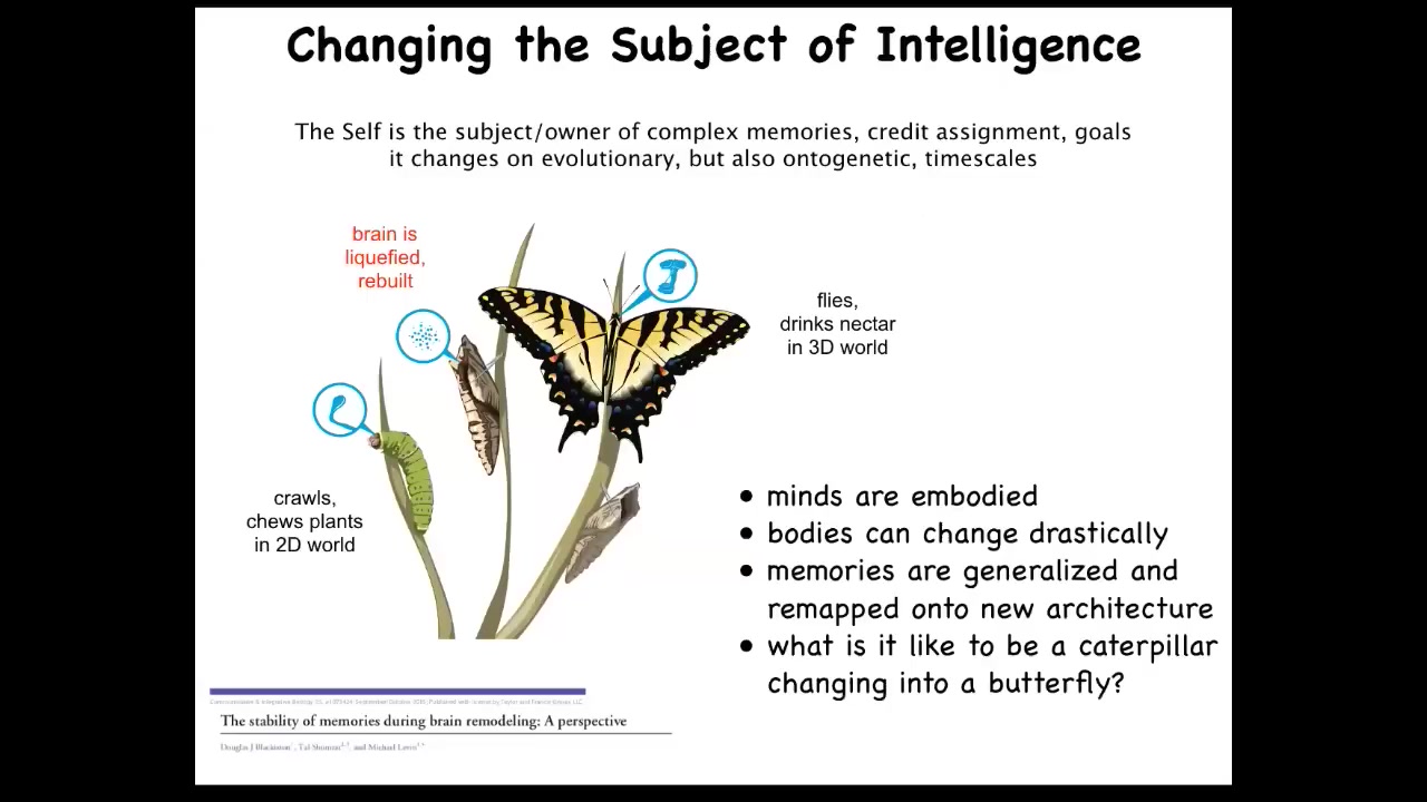 One is this, and it's the idea of transformation. You've got this caterpillar. Caterpillar has a particular brain suitable for driving a soft-bodied robot. There are no hard elements in the caterpillar, so you can't push. The controller can't push on any of the elements. It eats leaves, and it lives in a two-dimensional world. It has to transform into this completely different type of creature, which is a hard body, so it needs a different controller that can now push on all these hard elements. It lives in the three-dimensional world. It flies, and it doesn't eat leaves; it drinks nectar.