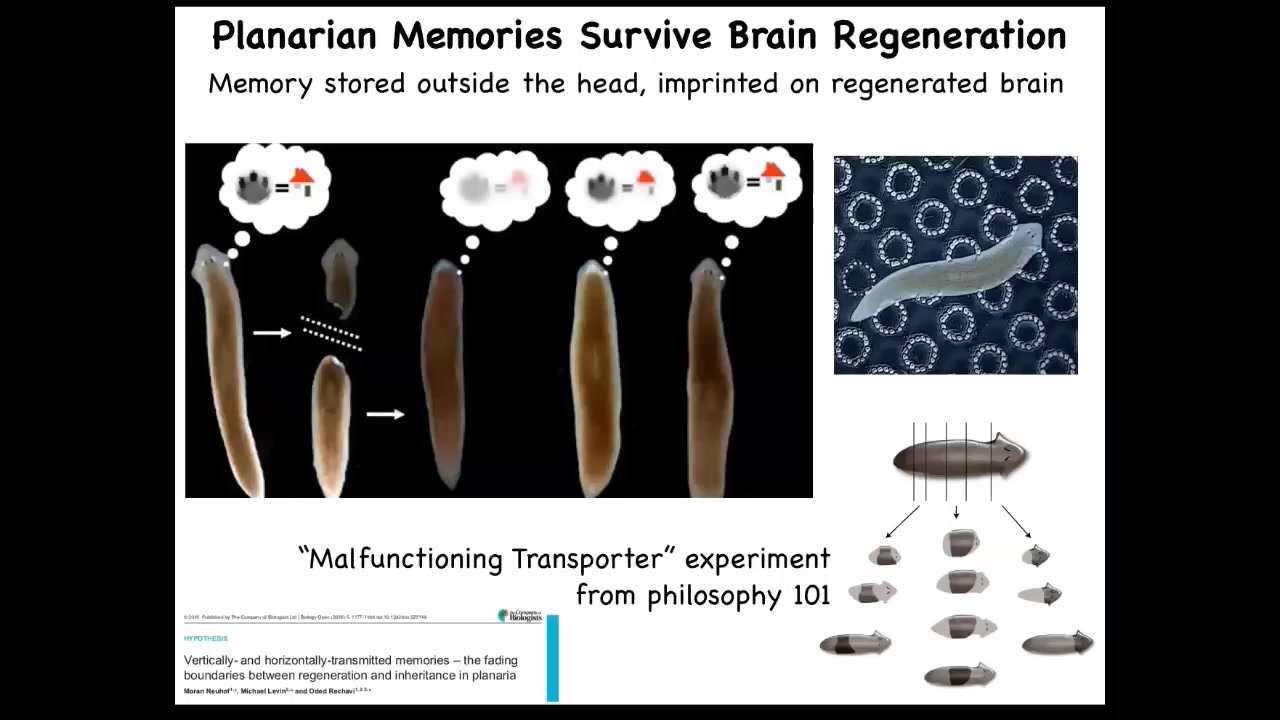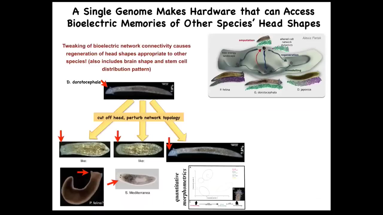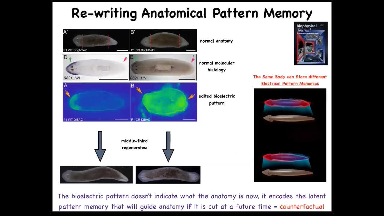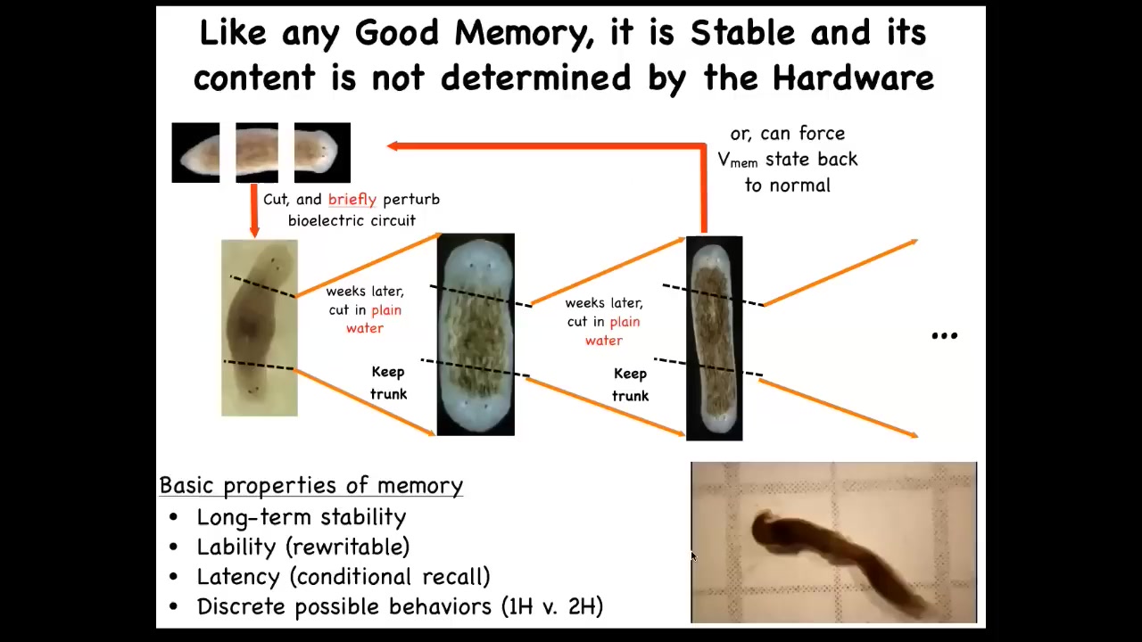 A normal worm body can store up to one of two different, but this is what we know now, two different representations of what a correct planarian looks like. It's actually a counterfactual memory because at this point, the body is not two-headed and yet it has this pattern. It's not what's happening now, it's what you're going to do if you get injured in the future. It might be the evolutionary precursor of this amazing mental time travel that brains allow us to do.
